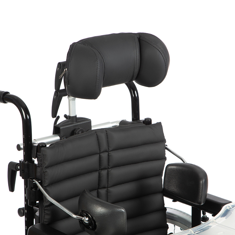 Подголовник и боковые поддержки коляски регулируются по вертикали, горизонтали, углу наклона и обхвату головы, обеспечивая надежную фиксацию и поддержку. Это помогает предотвратить деформации грудной клетки и позвоночника, а также улучшает постуральный баланс. Съемный столик служит дополнительной опорой для верхней части тела, что особенно полезно во время приема пищи.